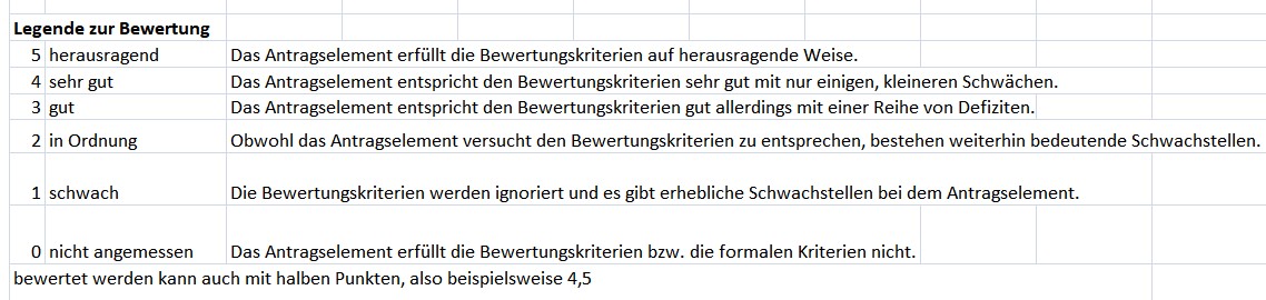 Maximal fünf Punkte pro Kriterium können vergeben werden, ebenso stellt jedes Jurymitglied die Stärken und Schwächen eines jeden Antrags heraus. Diese Methode stammt aus dem wissenschaftlichen Bereich, ist also durchaus üblich. Aus den Einzelbewertungen werden Durchschnittswerte gebildet. Daraus ergibt sich ein relativ objektives Endergebnis, also eine Liste mit einem eindeutigen Ranking.