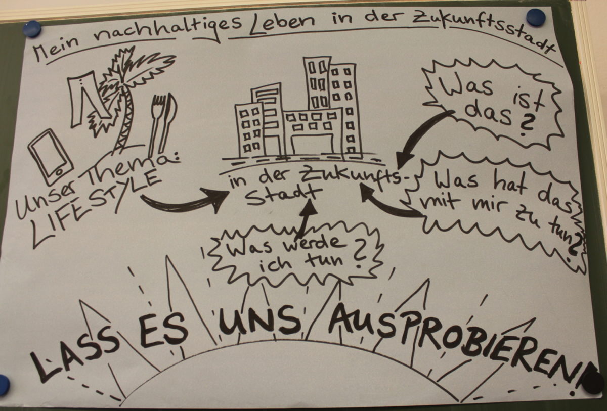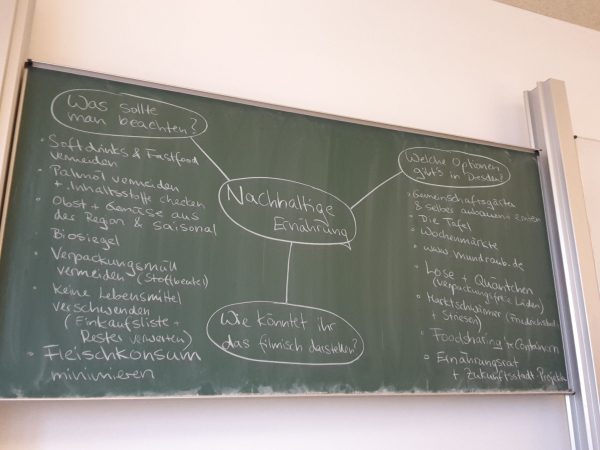 Dort erfuhren die Jugendlichen mehr über die globalen Auswirkungen ihres Konsums, berechneten ihren Ökologischen Fußabdruck und lernten verschiedene Dresdner Nachhaltigkeitsakteure, wie die Gemeinschaftsgärten, die Dresdner Tafel oder den Konglomerat e.V. kennen. Sie stellten sich Fragen wie: Welche Aspekte von nachhaltigem Konsum sind für dich persönlich spannend? Was sind in deinen Augen die drängenden sozialen und ökologischen Probleme unserer Zeit? Anhand der globalen Perspektive auf die alltäglichen Dinge des täglichen Bedarfs (u. a. Kleidung, Ernährung, elektronische Geräte, Mobilität, Plastik, Kosmetik) wurden von den Jugendlichen anschließend mögliche persönliche Lösungsansätze gesucht, debattiert und als Alltagschallenge konzipiert.