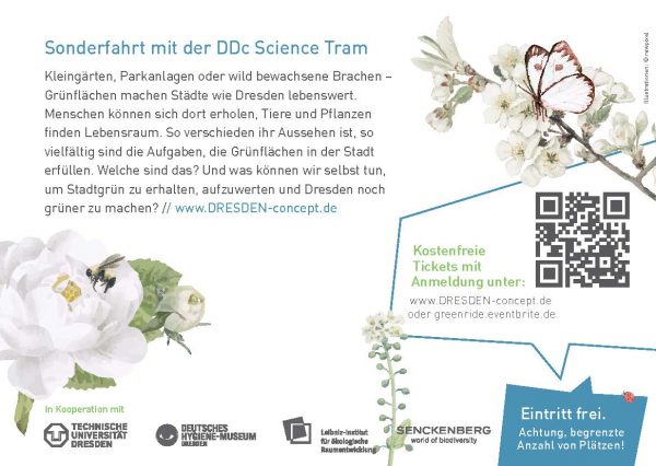 Ob Kleingärten, Parkanlagen oder wild bewachsene Brachen – Grünflächen machen Städte wie Dresden lebenswert. Menschen können sich dort erholen, Tiere und Pflanzen finden Lebensraum. Grün in der Stadt macht heiße Sommer erträglicher und kann Schäden durch Hochwasser mildern. So verschieden ihr Aussehen ist, so vielfältig sind die Aufgaben, die Grünflächen in der Stadt erfüllen. Welche sind das? Und was können wir selbst tun, um Stadtgrün zu erhalten, aufzuwerten und Dresden noch grüner zu machen? Diesen und zahlreichen anderen Fragen, widmen sich Wissenschaftlerinnen und Wissenschaftler aus unterschiedlichen DRESDEN-concept-Einrichtungen bei einer Sonderfahrt in der Science Tram.