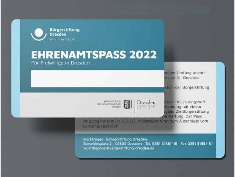 Die Bürgerstiftung Dresden ist Kooperationspartner der Landeshauptstadt Dresden und vergibt mit deren Unterstützung auch für 2023 wieder den beliebten Ehrenamtspass. In der Adventszeit 2022 werden die Pässe bereits zum 21. Mal ausgereicht. Erstmals wird es wieder möglich sein, dass die Pässe auf den Weihnachtsfeiern der Vereine ausgeteilt werden.