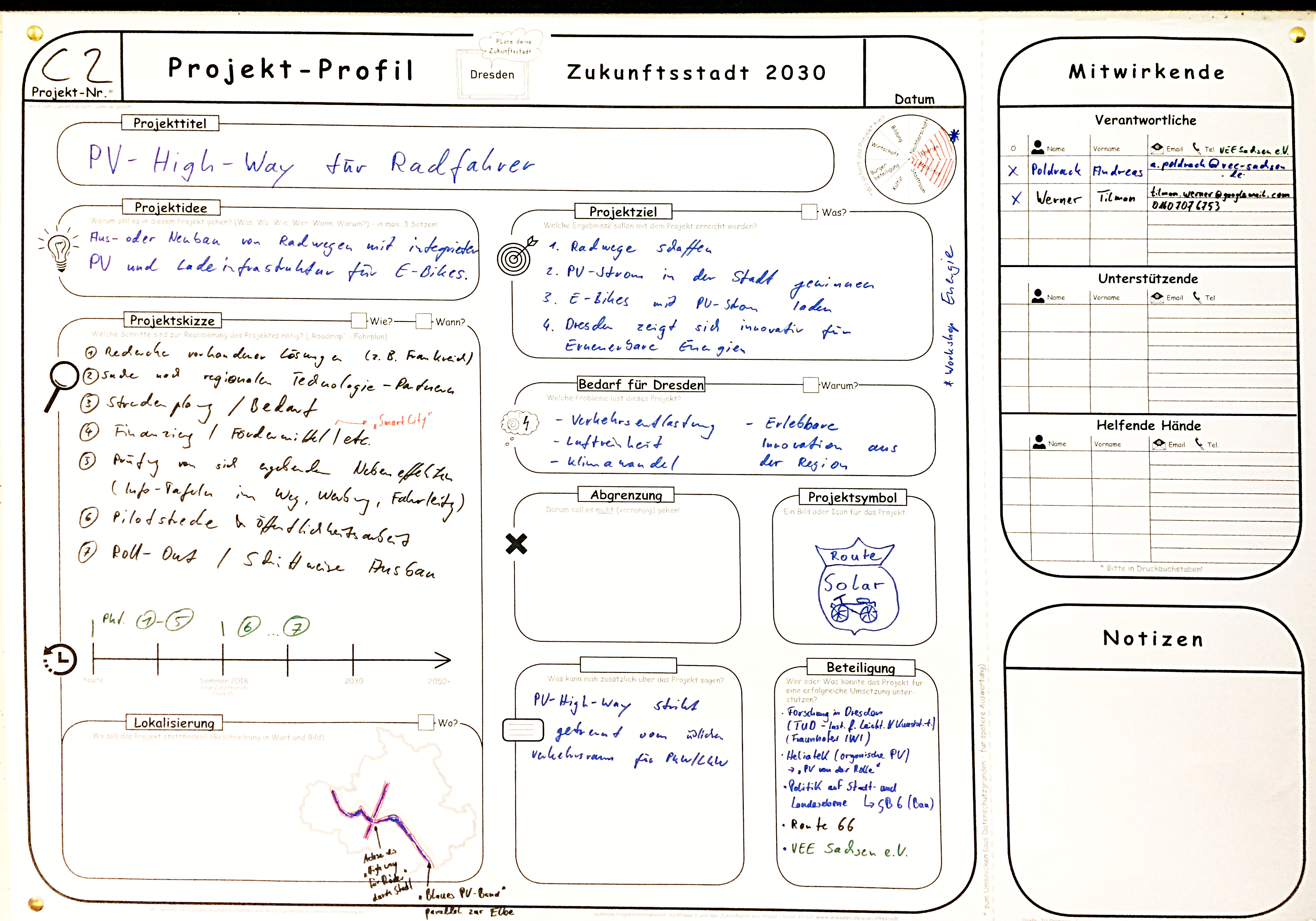 1. Radwege schaffen; 2. PV-Strom in der Stadt gewinnen; 3. E-Bikes mit PV-Strom laden; 4. Dresden zeigt sich innovativ für erneuerbare Energien