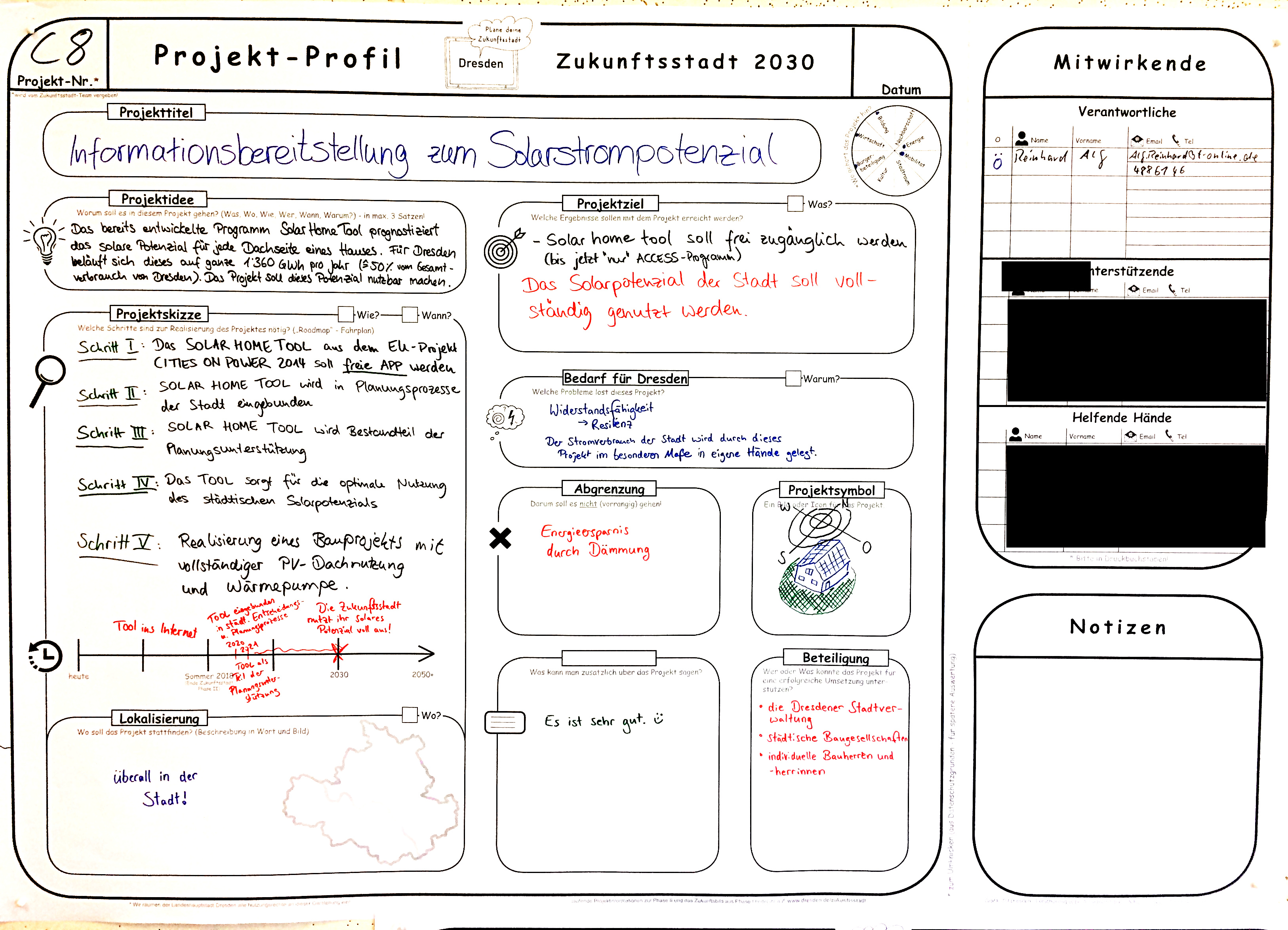 Das bereits entwickelte Programm Solar Home Tool prognostiziert das solare Potential für jede Dachseite eines Hauses. Für Dresden beläuft sich dieses auf ganze 1360 GWh pro Jahr ( = 50 % vom Gesamtverbrauch von Dresden). Das Projekt soll dazu beitragen, dieses Potenzial im Neubaubereich nutzbar zu machen!