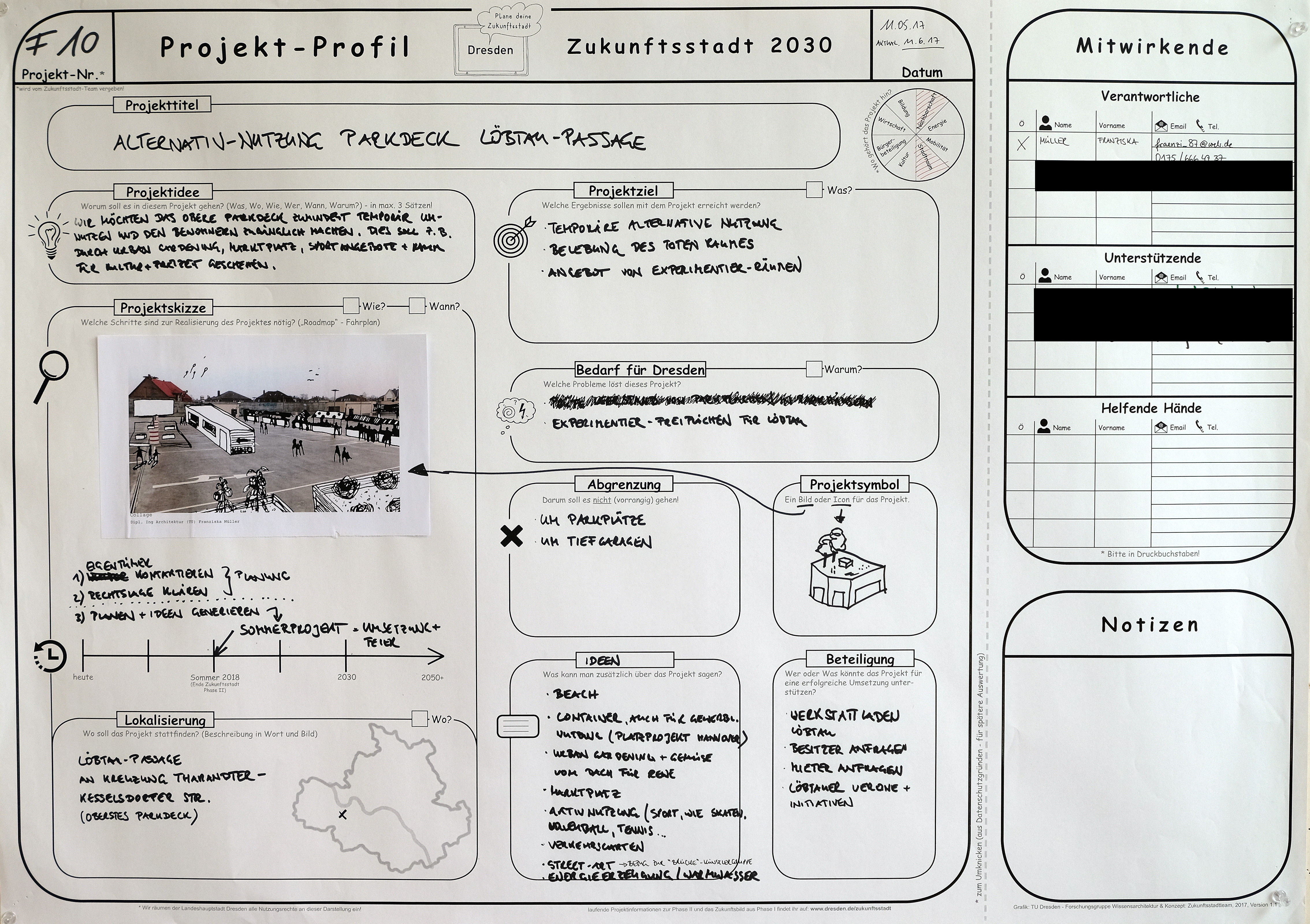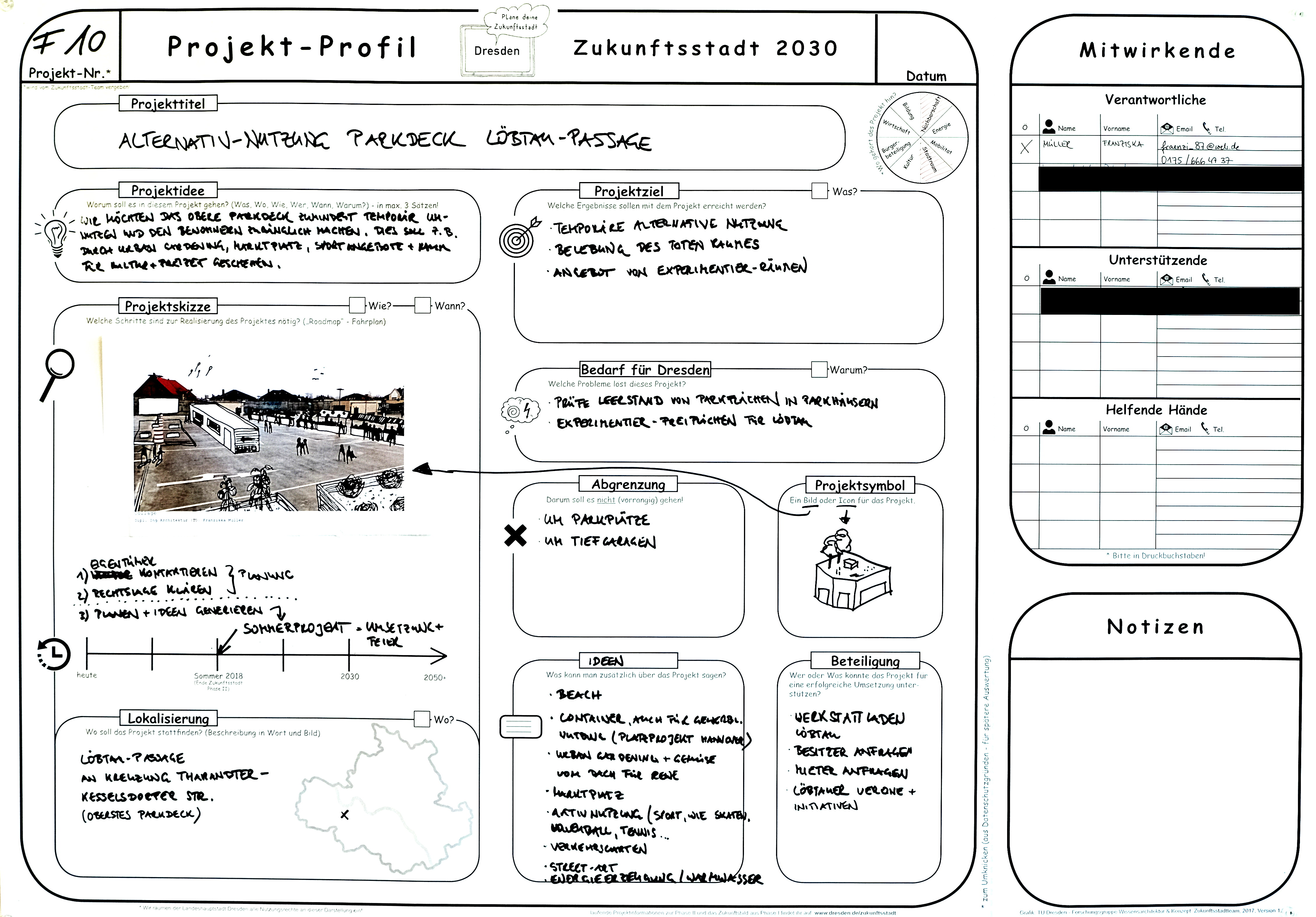 Wir möchten das obere Parkdeck zumindest temporär unnutzen und den Bewohnern zugänglich machen. Dies soll z.B. durch Urban Gardening, Marktplatz, Sportangebote + Raum für Kultur und Freizeit geschehen.