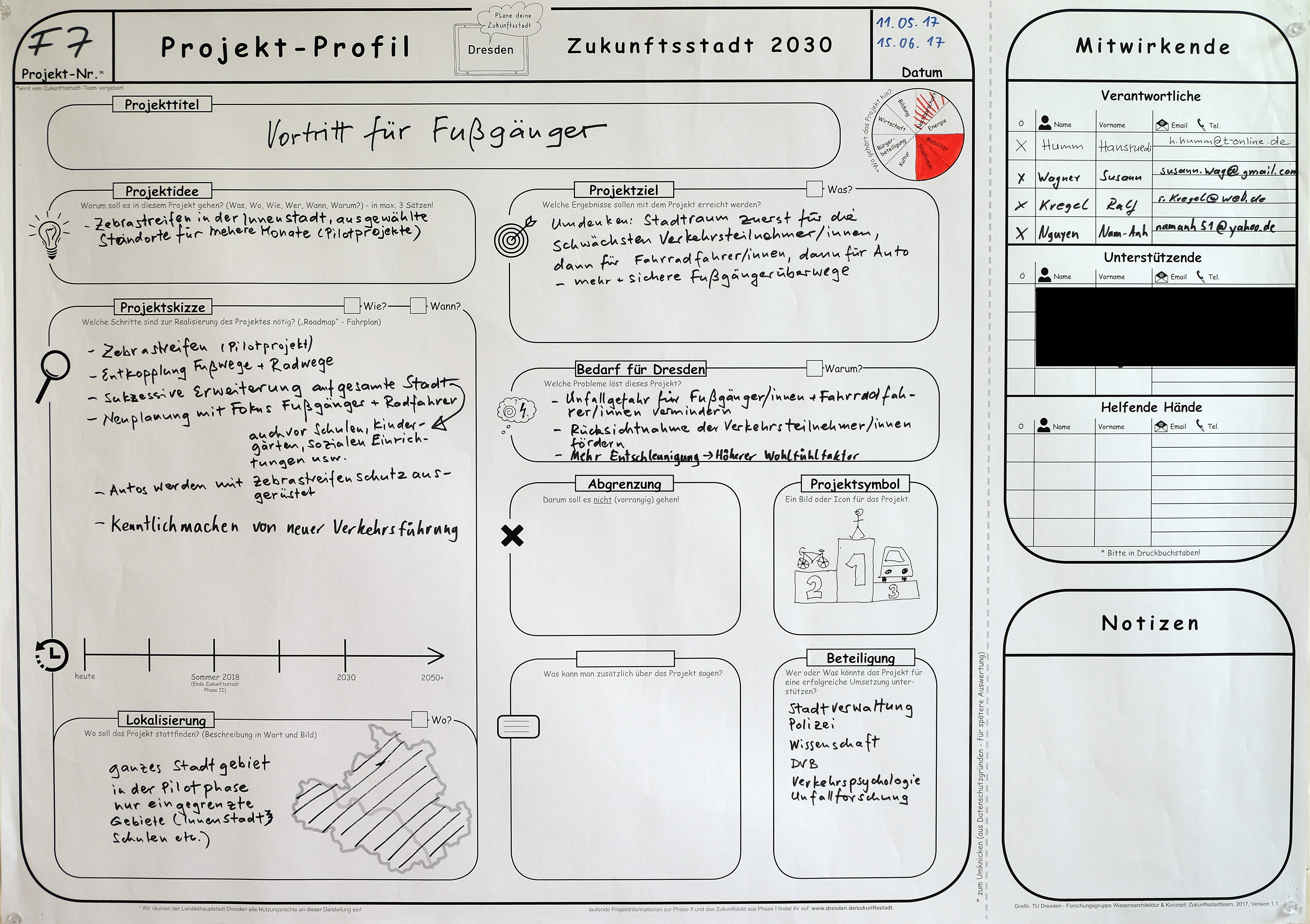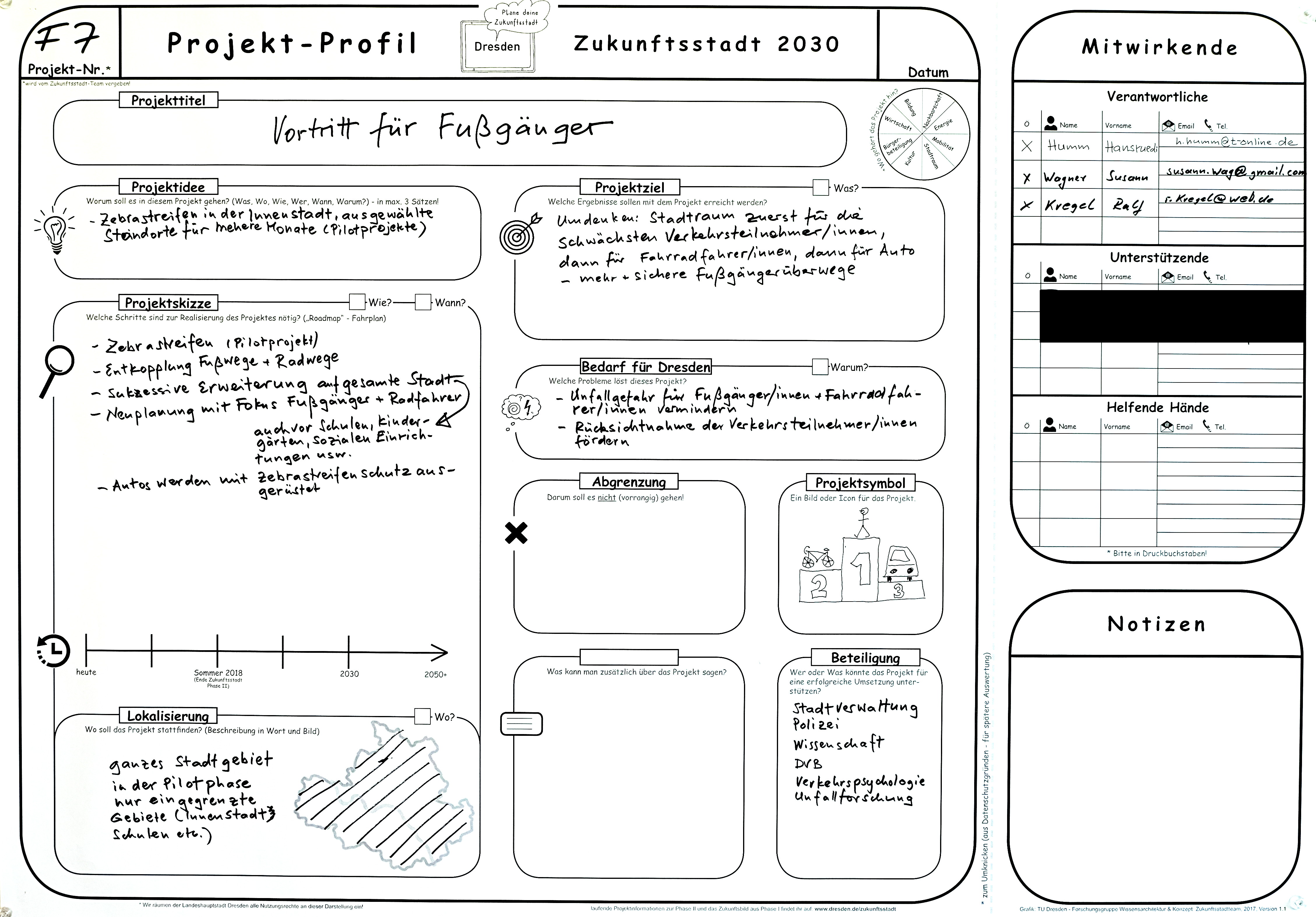 Ziel ist, dass die Stadt Dresden ab 2030 dem schwächsten Verkehrsteilnehmer, dem Fußgänger, die oberste Priorität einräumt. Bei allen Verkehrsplanungen und -maßnahmen wird zuerst auf das Wohl des Fußgängers geachtet. In zweiter Linie werden die Bedürfnisse der Radfahrer berücksichtigt. Und schließlich werden die Interessen des motorisierten Autoverkehrs einbezogen.