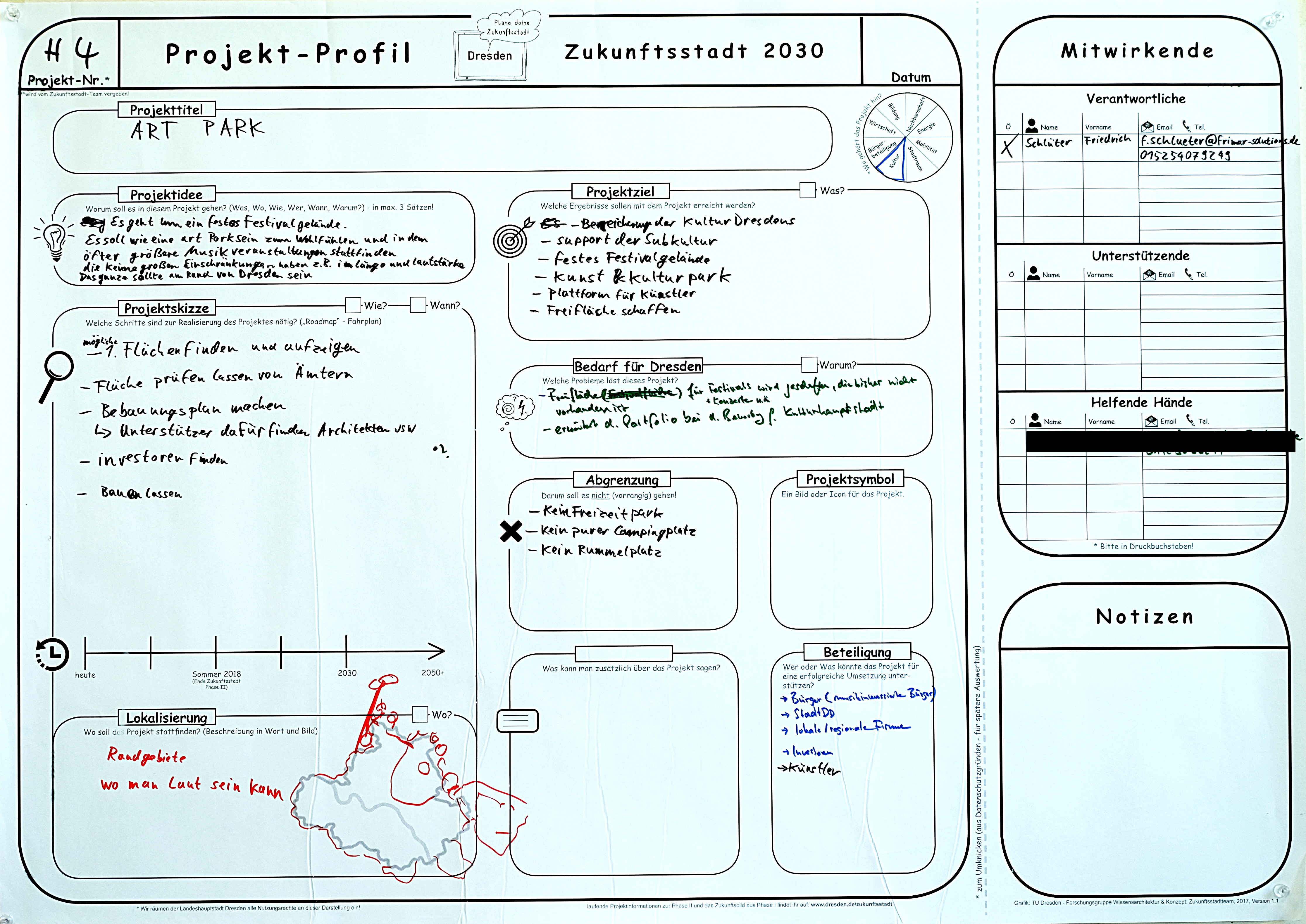 Es geht um ein festes Festivalgelände. Es soll eine Art Park sein zum Wohlfühlen und in dem öfter größere Musikveranstaltungen stattfinden, die keine großen Einschränkungen haben, z.B. in Länge und Lautstärke. Das ganze soll am Rand von Dresden sein.