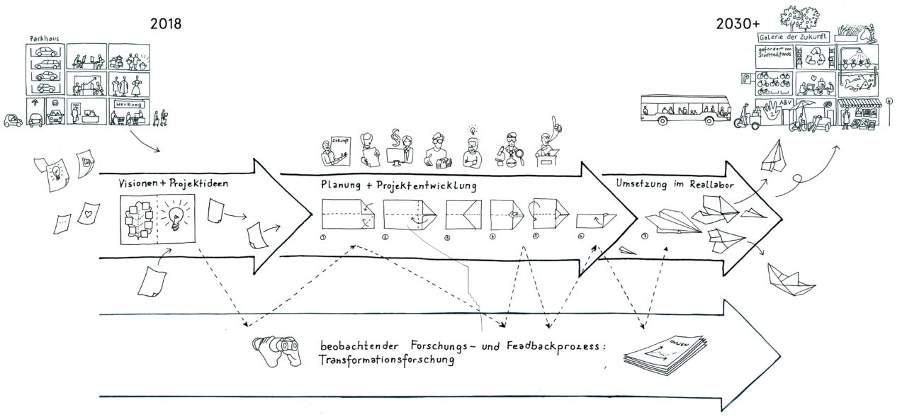 Jede Phase war ein Experiment. Zum Ablauf, zur Umsetzung oder zur Verankerung in der Stadtgesellschaft gab es keinerlei Vorgaben. Voraussetzungen waren einerseits, dass es ein transdisziplinärer, ko-kreativer und ko-produktiver Prozess für eine nachhaltige und partizipative Stadtentwicklung werden sollte. Und andererseits sollte der Prozess eine Begleitforschung haben, um die transformativen Effekte wissenschaftlich fundieren zu können.