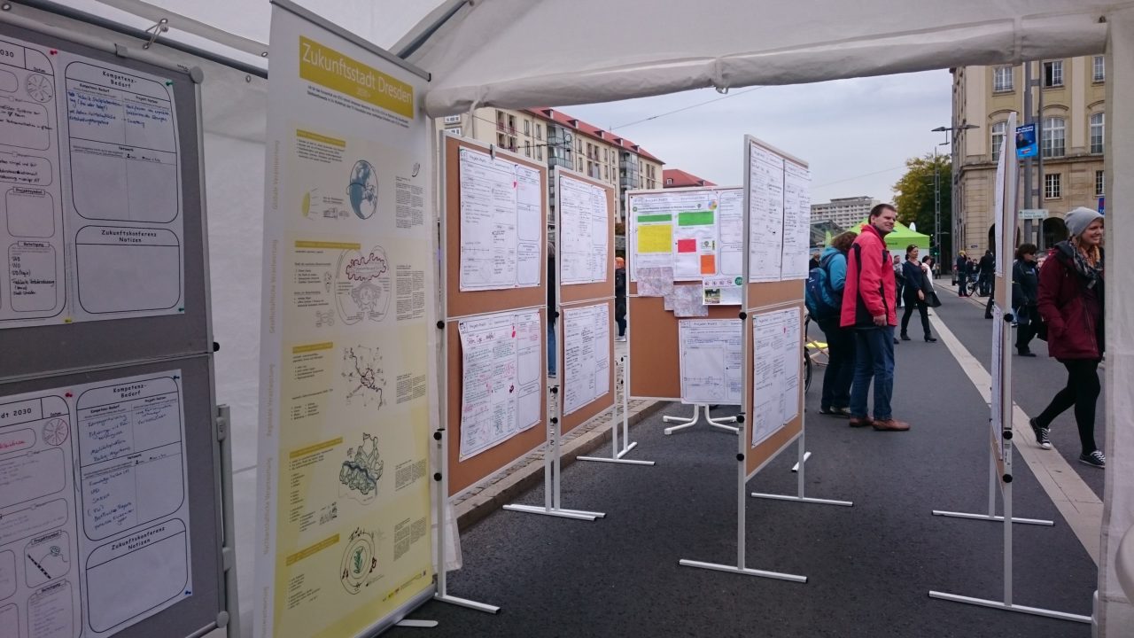Der auf dem Altmarkt parallel stattgefundene Herbstmarkt lockte viele Neugierige an, die auf dem „Autofreien Tag“ auf der Wilsdruffer Straße vermutlich sonst nicht vorbeigeschaut hätten. Dennoch stießen wir, neben vielen positiv überraschten und interessierten Bürgern, mitunter leider auf Unverständnis. Es wurde deutlich, wie verschwindend die Zuversicht, dass wir oder „die Stadt“ etwas bewegen können, zuweilen ist. Mit „Es fehlen sowieso die Mittel.“, „Die [Projekt-Teams] wissen doch nicht, was sie tun.“oder „Das geht mich nichts mehr an, 2030 erlebe ich nicht mehr.“ wurde der Zukunftsstadt-Prozess kommentiert.