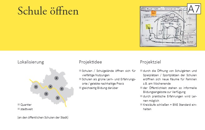 Geht es nach Sigrid Böttcher-Steeb, Thomas Kowalski und ihren Mitstreitern, existieren im Dresden der Zukunft keine betonierten Schulhöfe mehr, die außerhalb der Schulzeiten eh von niemandem genutzt werden dürfen. Mit ihrem Projekt (A7) sollen die Außenareale nach ihrer Umgestaltung als „lebendiger Lernraum, Spielraum, Bewegungsraum und Erholungsraum“ wahrgenommen werden.